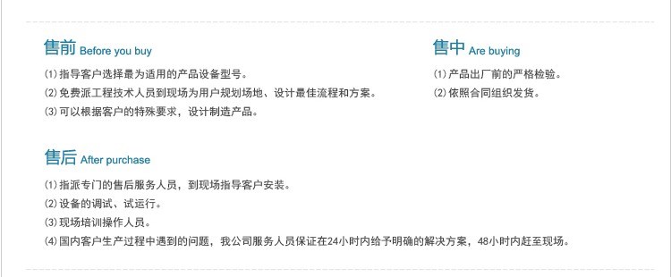 3.服務時間承諾:生產(chǎn)設備到達顧客廠房前請與售后服務部預約調(diào)試人員到達現(xiàn)場時間,根據(jù)要求會按期到達現(xiàn)場,設備運行中出現(xiàn)緊急情況不能處理時,直接反饋到售后服務部,工作時間外請于合同當事人或營銷負責人取得聯(lián)系,當接到通知后12小時到達現(xiàn)場。
